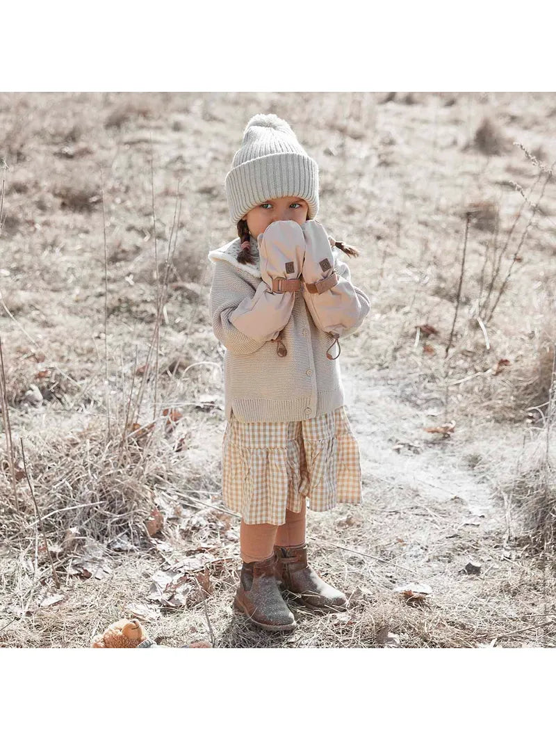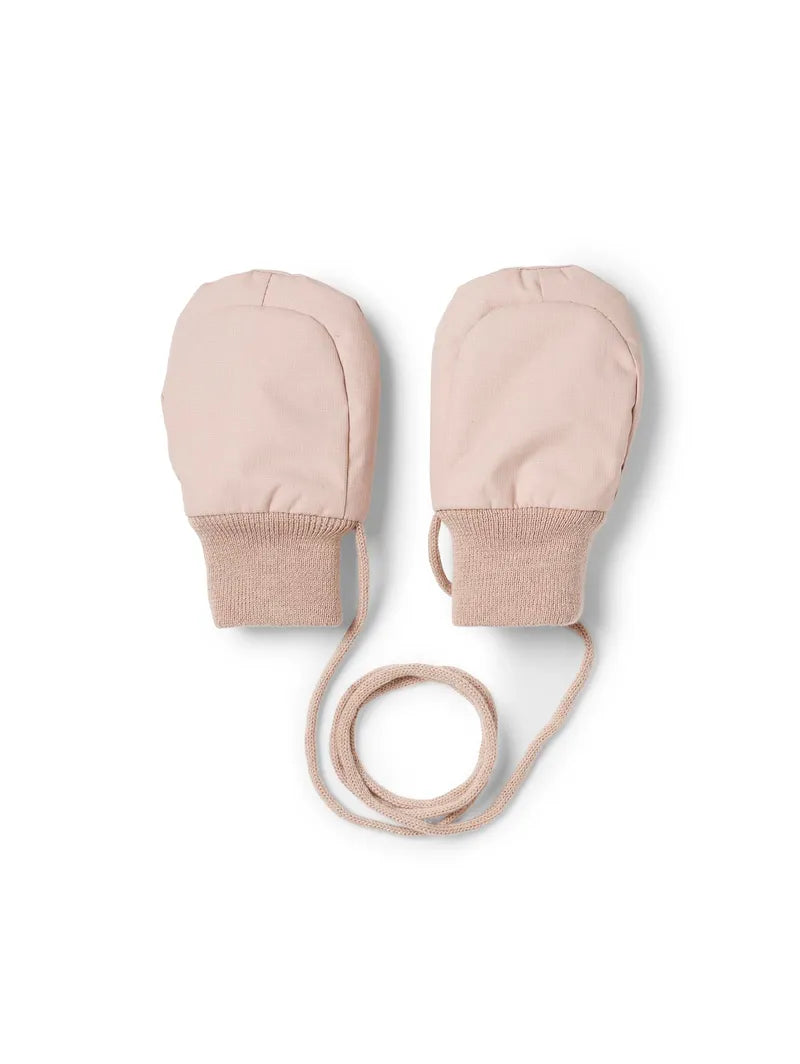 Den mindre storleken är tumlös och har en bomullssnodd mellan vantarna för att förhindra att de tappas bort, samt en stor bomullsmudd som håller dem på plats. Det yttre tyget är både vind- och vattenavvisande tack vare Bionic Finish RUDOLF®.