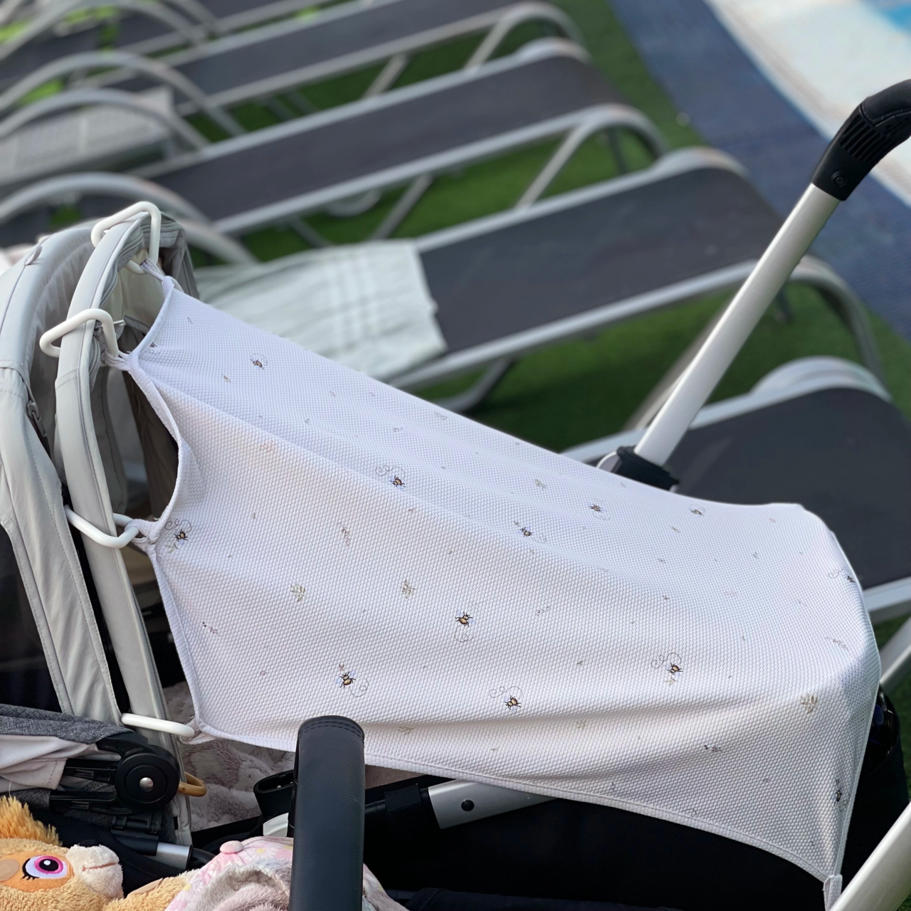 UV-gardinen är universal och kan enkelt användas på barnvagn eller bilstol. Medföljande plastringar gör det enkelt att fästa gardinen smidigt på olika ytor, vilket gör den till en flexibel lösning för solskydd.