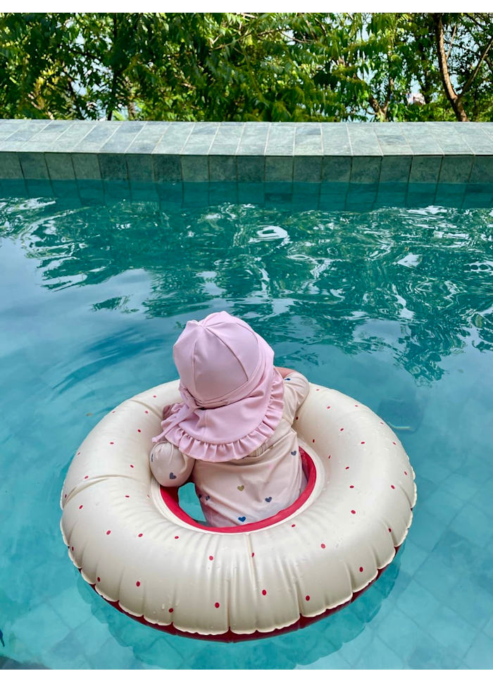 Den justerbara passformen med resår och knytband gör att hatten sitter tryggt och bekvämt. Tyg som andas och torkar snabbt gör den idealisk för både strand, bad och lek i solen.