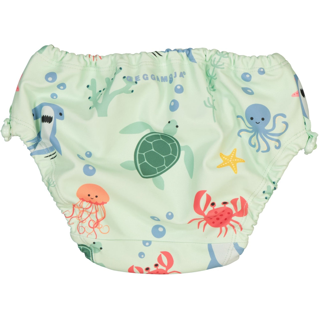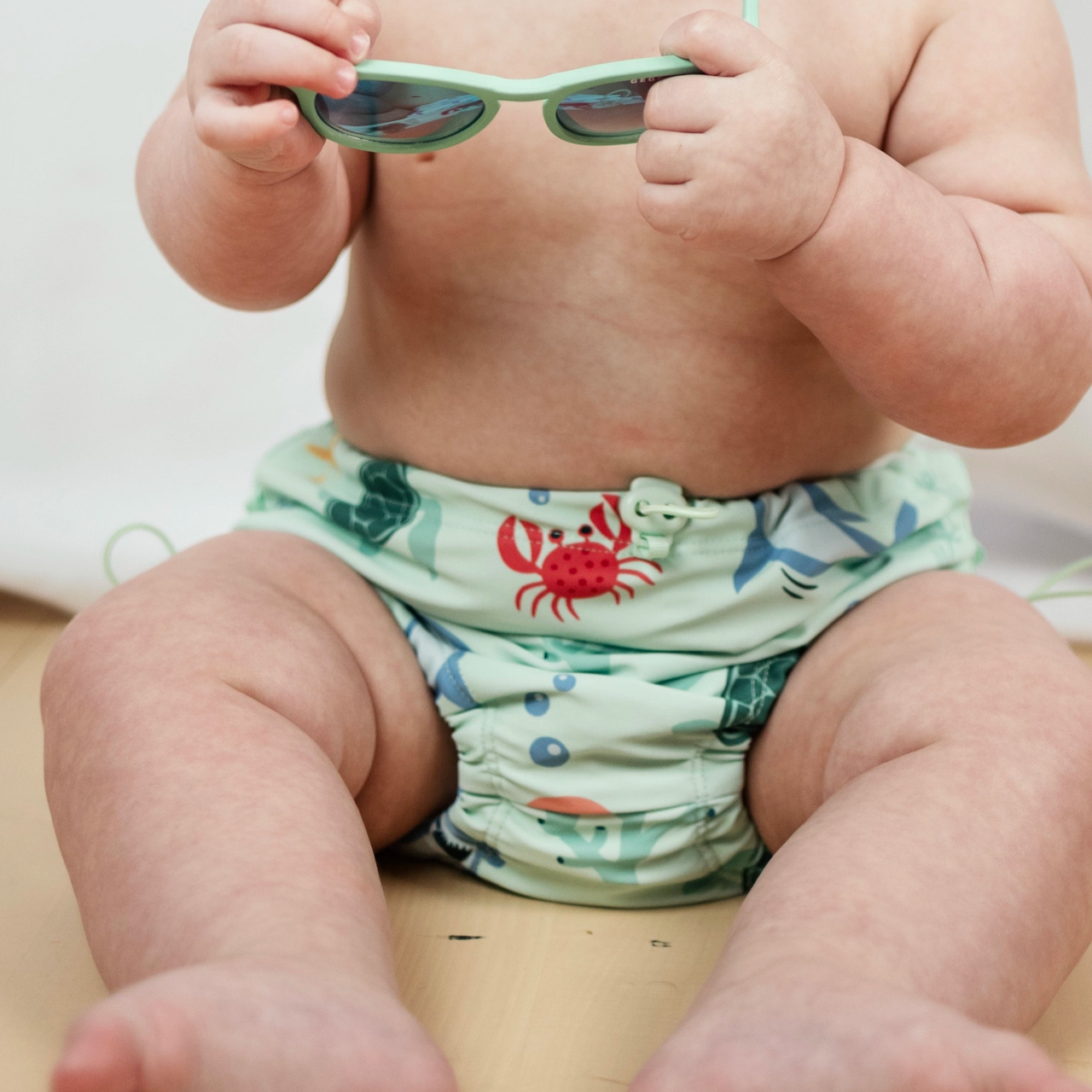 Låt oss presentera UV-Badblöja Havsdjur Blå från Geggamoja. Denna badbyxa är designad för att skydda ditt barn från solens skadliga strålar med ett UV-skydd på 50+, vilket blockerar 98% av UVA- och UVB-strålarna. Perfekt för babysim, den är tillverkad i snabbtorkande, återvunnet material och kräver ingen extra blöja eller inlägg.