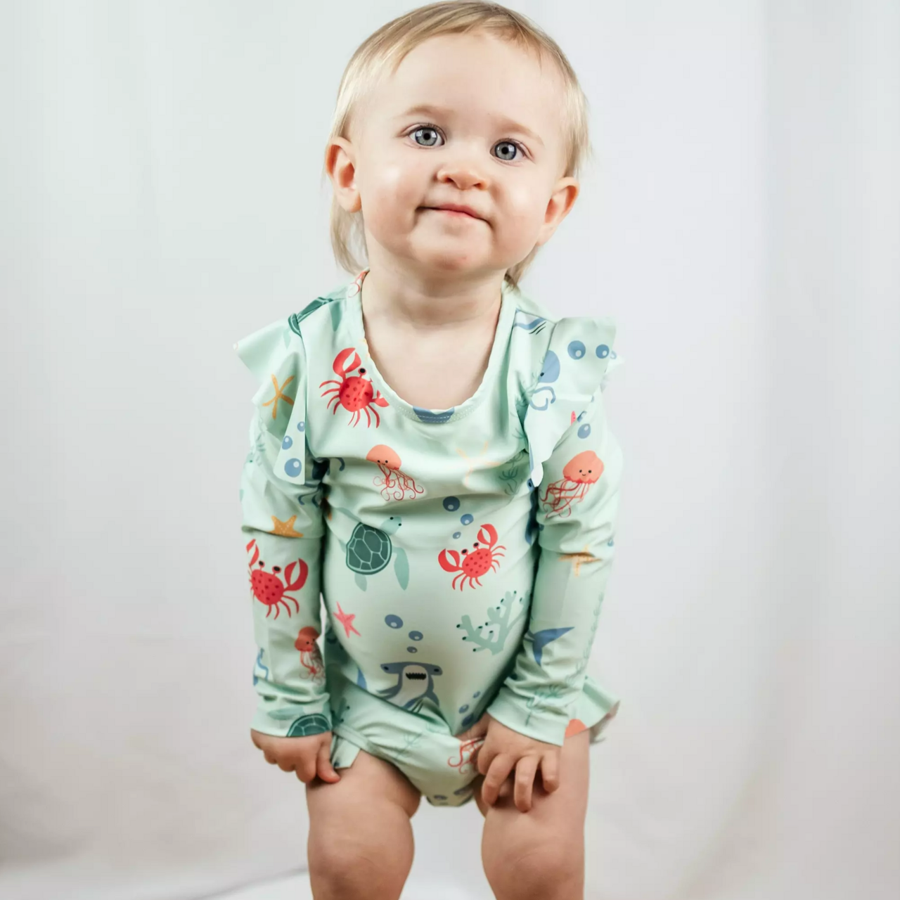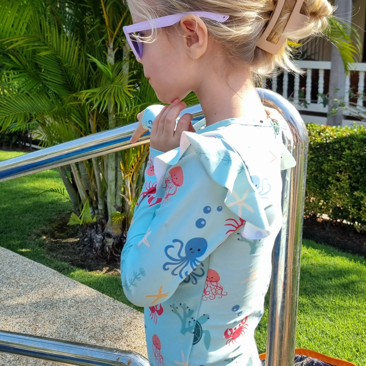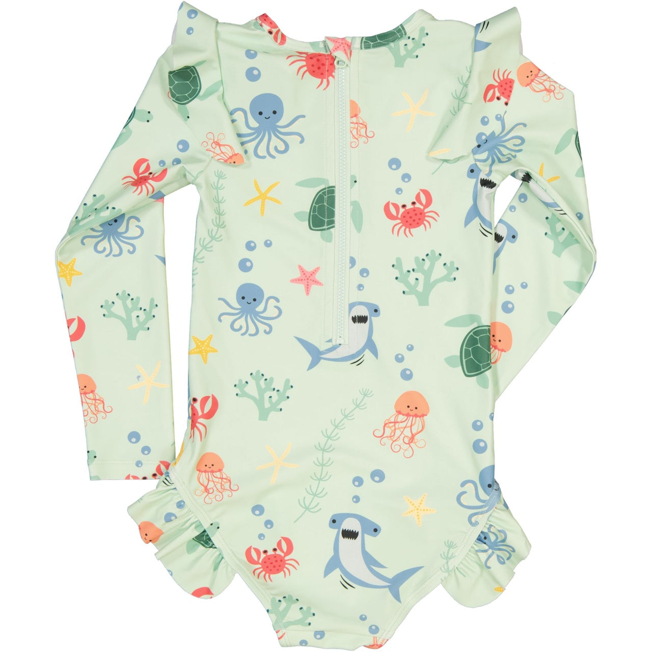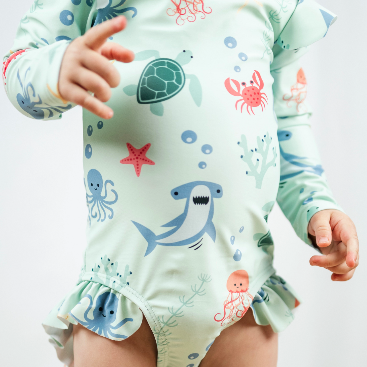 Låt oss presentera UV-Baddräkt lång arm Havsdjur Blå från Geggamoja. Denna charmiga baddräkt är designad med volangdetaljer på axlarna och har långa armar för extra solskydd. Med en praktisk dragkedja bak är den enkel att ta på och av, vilket gör den perfekt för aktiva dagar vid stranden eller poolen.