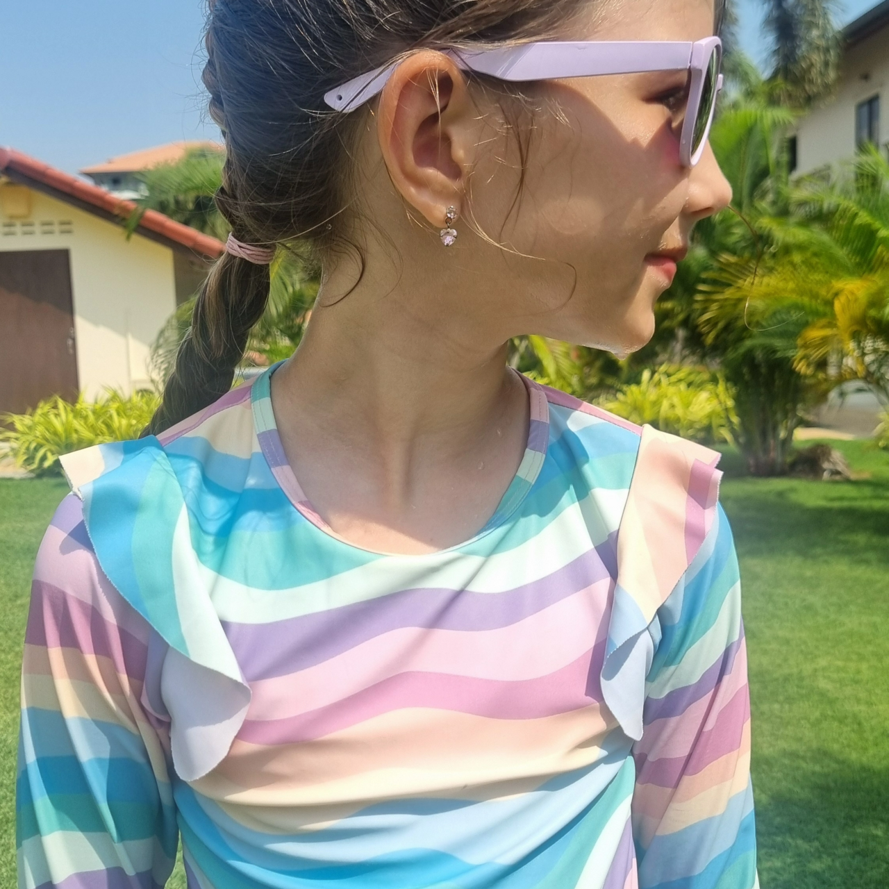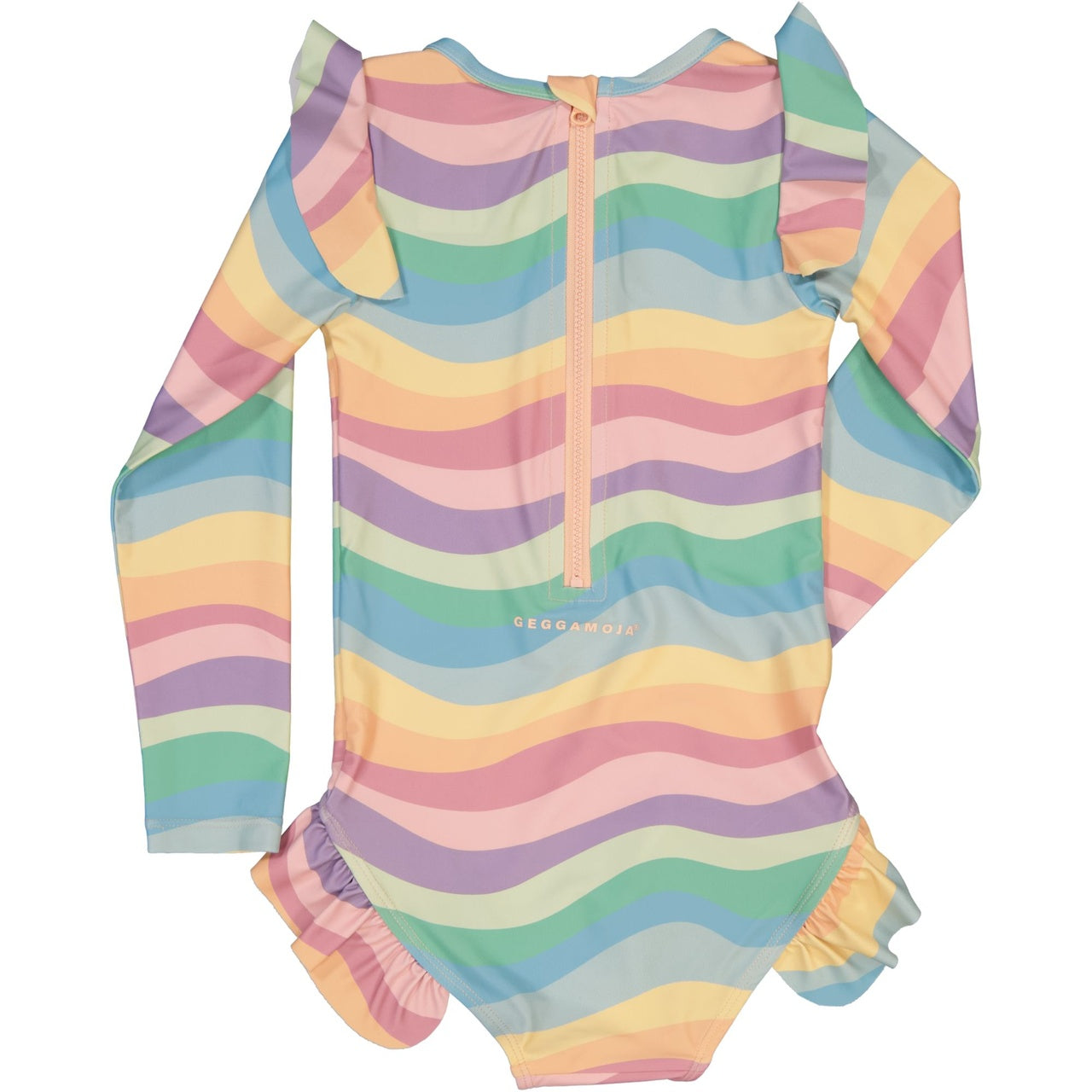 Låt oss presentera UV-Baddräkt lång arm Regnbåge från Geggamoja, en söt baddräkt med volangdetaljer på axlarna. Den är designad med långa armar och en praktisk dragkedja bak för enkel på- och avtagning. Tillverkad av snabbtorkande material, är denna baddräkt perfekt för aktiva dagar vid stranden eller poolen.
