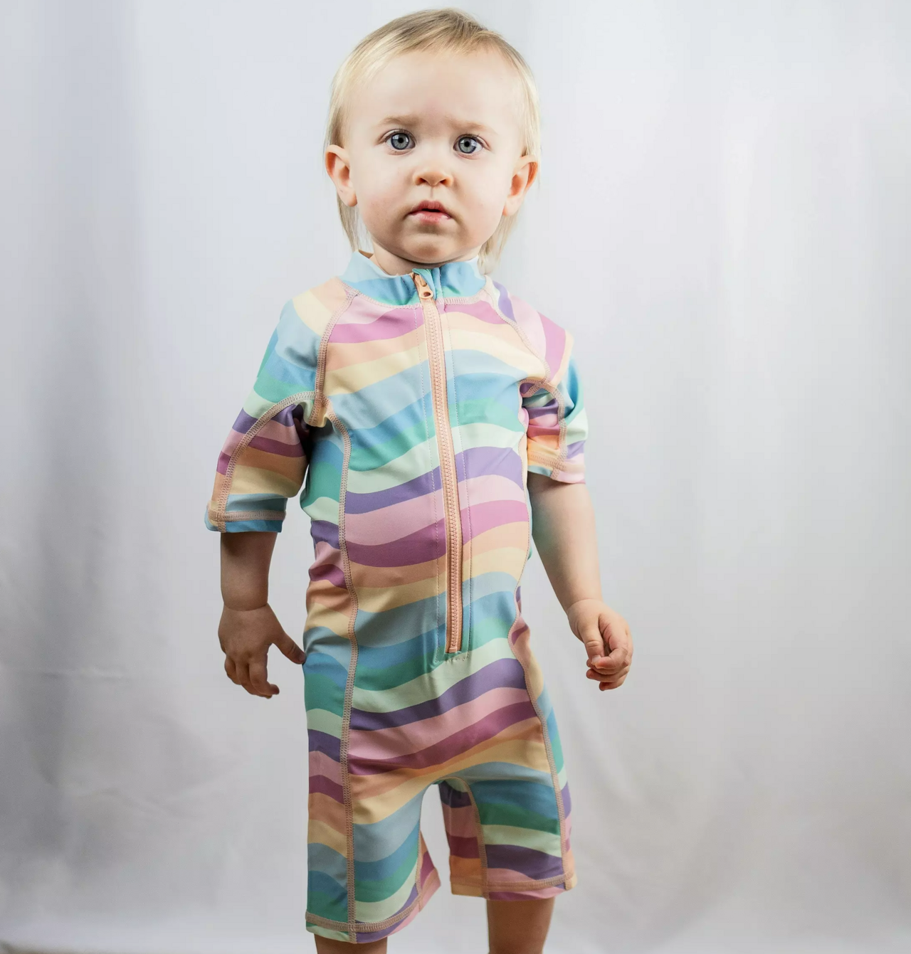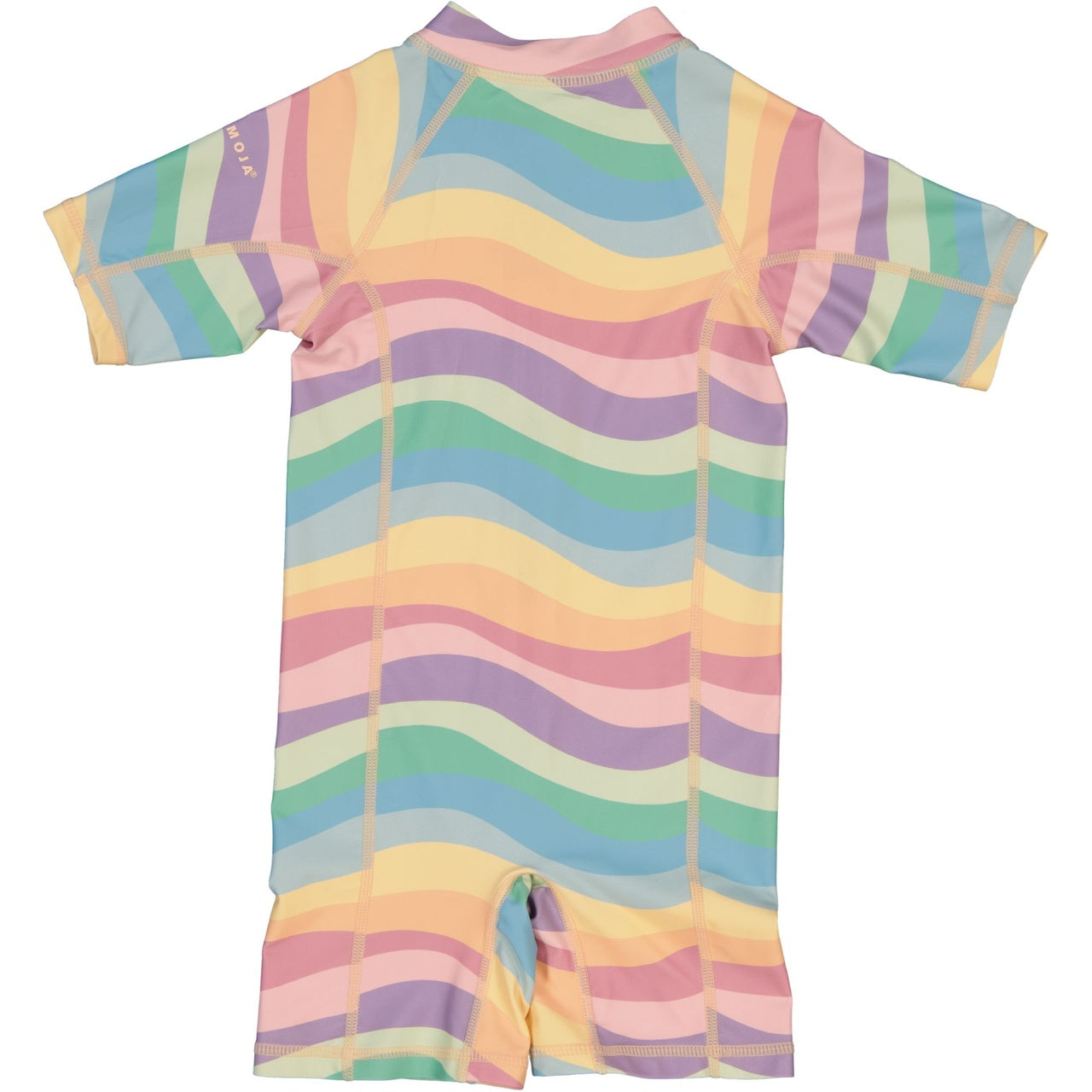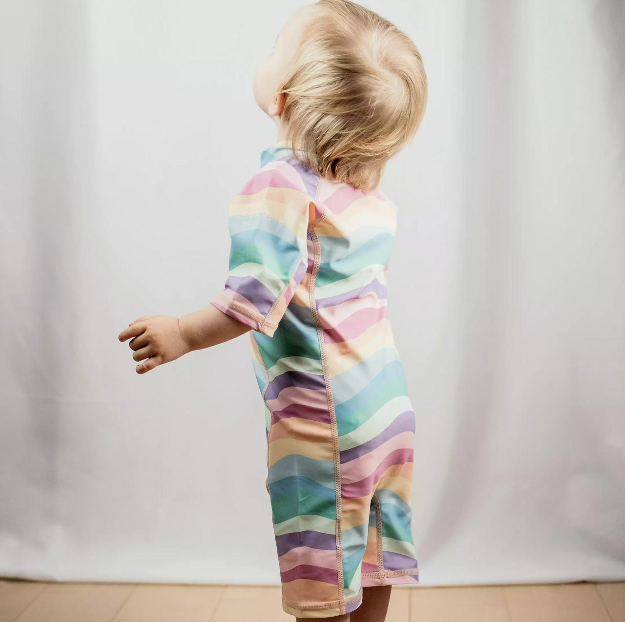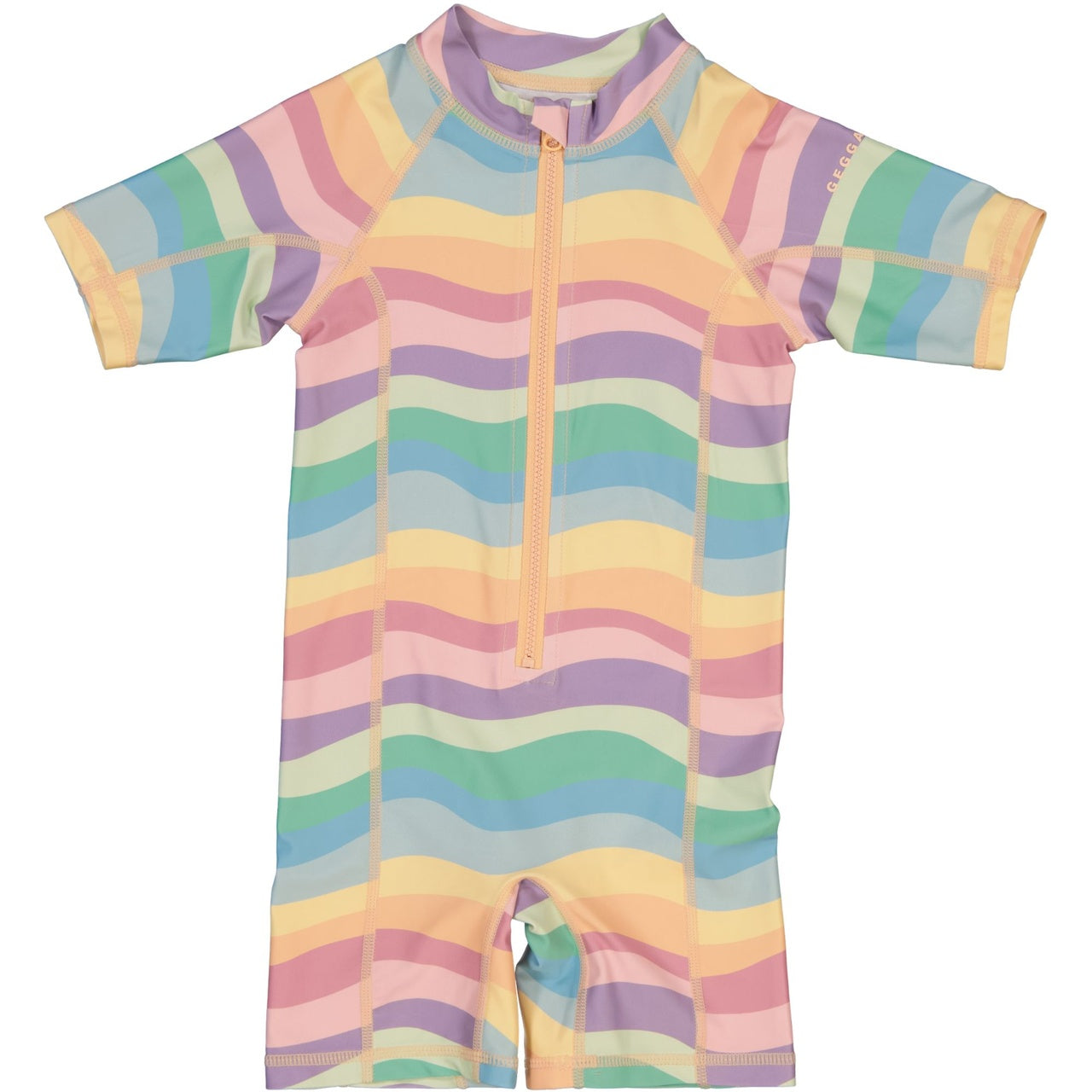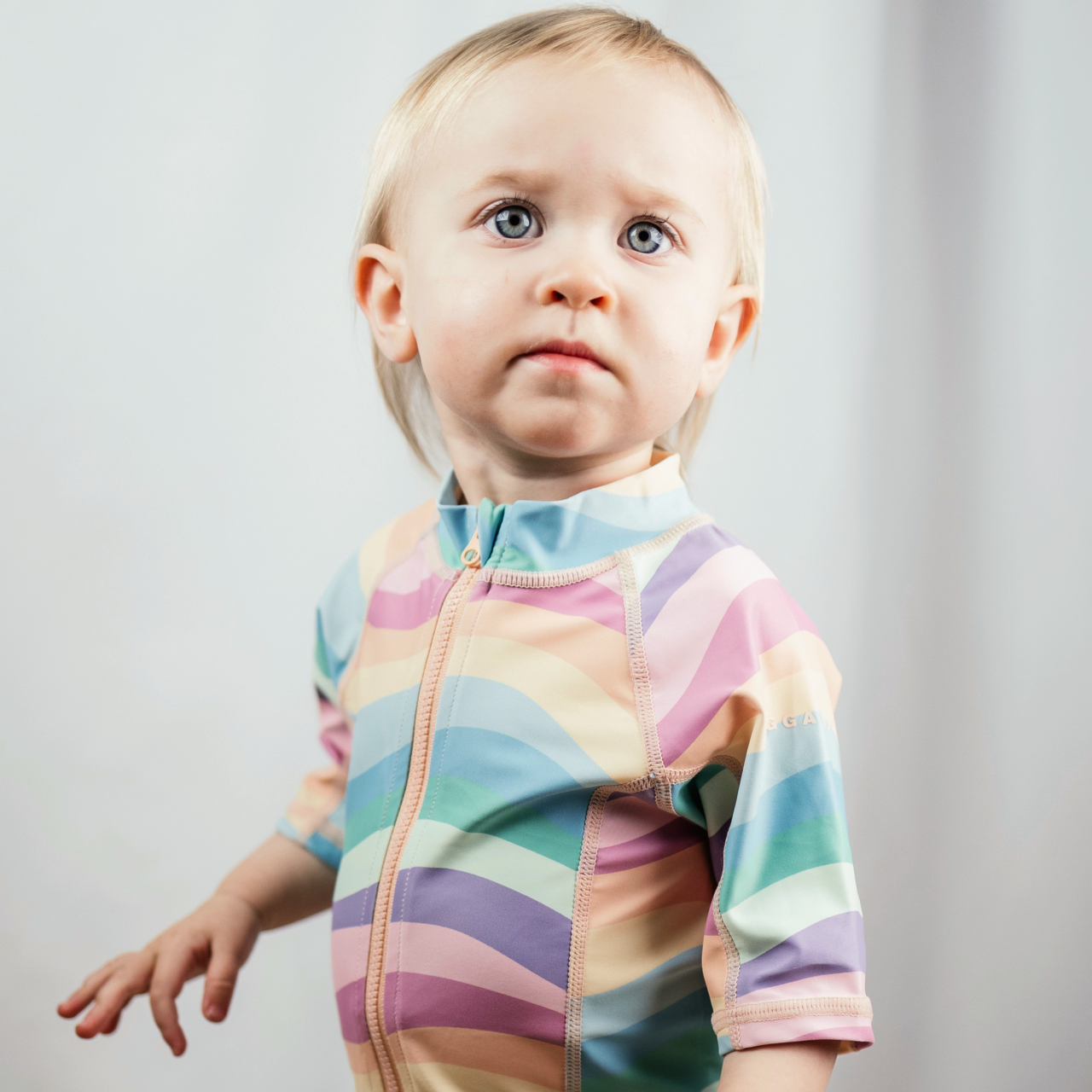 Låt oss presentera UV-Dräkt Regnbåge från Geggamoja. Denna UV-dräkt är designad för att skydda ditt barn mot solens strålar med stil och funktionalitet. Dräkten har korta ben och 3/4 ärmar, vilket gör den perfekt för soliga dagar vid stranden eller poolen. Den är tillverkad i ett snabbtorkande material och erbjuder ett solskydd på UV-50+, vilket blockerar 98% av solens skadliga UVA- och UVB-strålar.