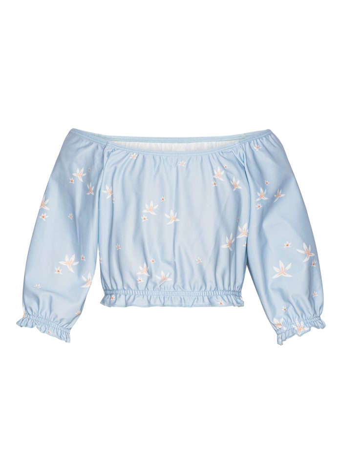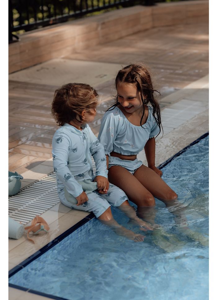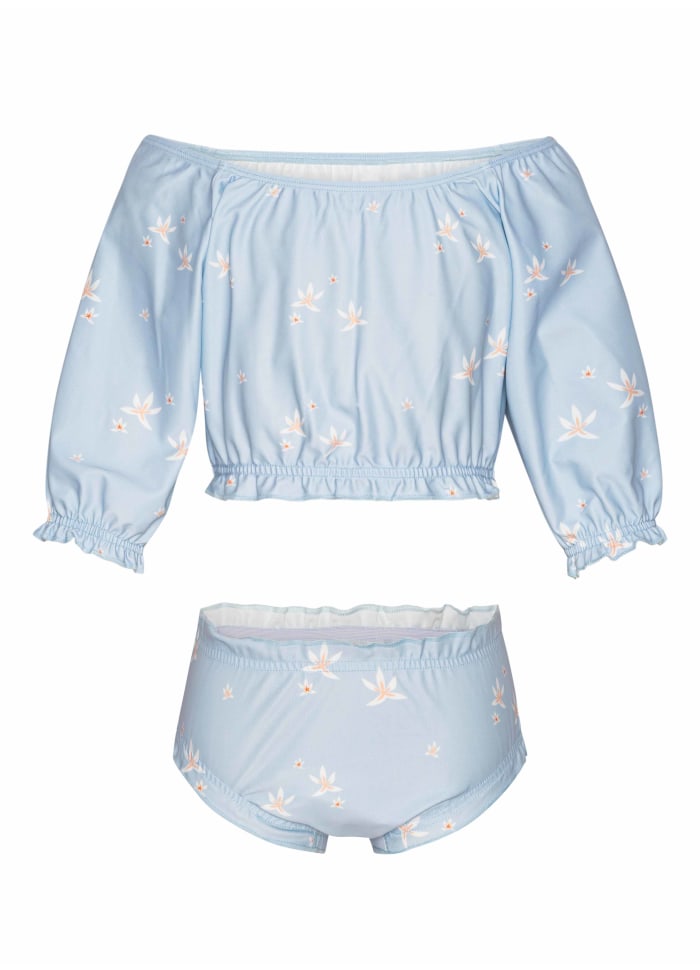 Låt oss presentera Bikini från Vanilla copenhagen. Denna tvådelade UV-bikini är framtagen för att ge barn full rörelsefrihet med ett material som är stretchigt, ventilerande och snabbtorkande. Volangärmarna skyddar axlarna mot solen och ger en extra söt touch.