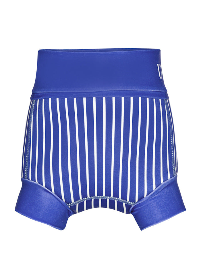 Låt oss presentera Neoprenbadbyxa - Azure - Striped från Vanilla copenhagen. Dessa badblöjor i neopren kombinerar skydd och komfort för små barn under vattenlek. Den höga midjan och de täta bensluten minimerar risken för läckage i vattnet och ger samtidigt fri rörelse.