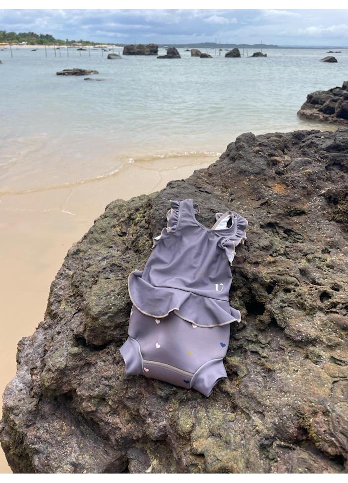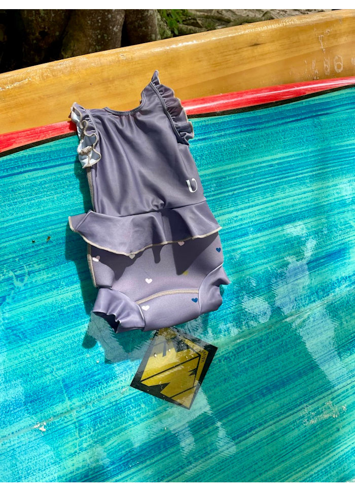 Låt oss presentera Neoprenbaddräkt med Volang - Wood - Hearts från Vanilla copenhagen. Denna charmiga UV-baddräkt i neopren kombinerar söt design med praktiska funktioner som hög midja, täta benslut och en dekorativ volang för en lekfull look.