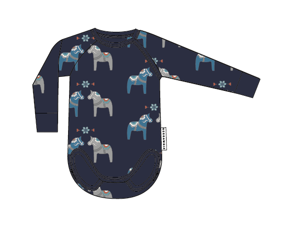 Låt oss presentera Body Bambu Dalahäst Navy från Geggamoja, en långärmad body som kombinerar komfort och stil. Tillverkad i en mjuk och skön materialblandning av bambu och ekologisk bomull, erbjuder den en behaglig känsla mot huden. De starka tryckknapparna i gren och ärmsöm gör den enkel att hantera, medan de breda muddarna i ärmslut ger extra komfort.