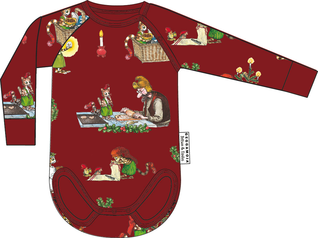 Body Pettson och Findus Röd har starka tryckknappar i grenen och vid ärmsömmarna för enkel på- och avklädning. De breda muddarna vid ärmsluten ger extra komfort och en bra passform. Detta är en perfekt body för barn som behöver både rörelsefrihet och komfort.