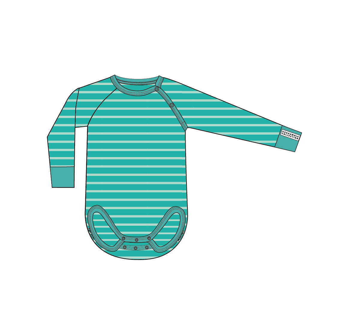 Låt oss presentera Body Turkos från Geggamoja, en randig body tillverkad i 100% ekologisk bomull. Denna body är designad med tryckknappar fram vid vänster axel för enkel påklädning och tre tryckknappar i grenen för att säkerställa en bekväm passform.