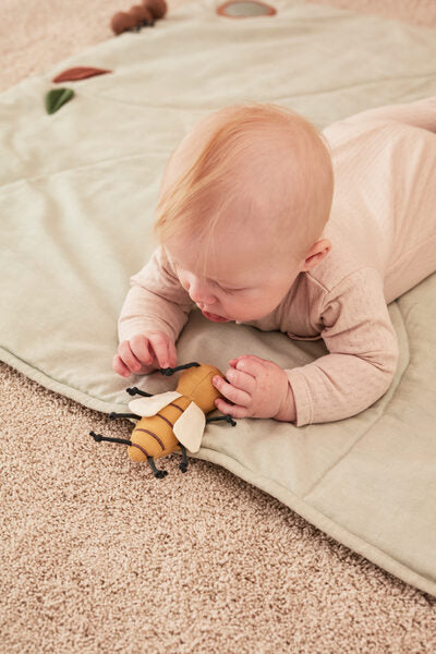 Figurerna på mattan, såsom myran My, biet Bea, och nyckelpigan Lars, erbjuder olika funktioner som pipljud och prassel, samt är gjorda i varierande material för att stimulera babyns sinnen. Upplevelsen främjar hörsel, beröring och syn, och låter barnet upptäcka en minivärld av de allra minsta djuren. Mattan levereras med en matchande förvaringspåse för enkel transport och förvaring.
