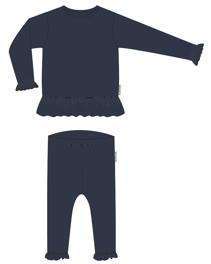 Låt oss presentera Tröja med leggings Marinblå från Geggamoja, ett stilrent och bekvämt set för barn. Tillverkat i ekologisk bomull, erbjuder detta set både komfort och hållbarhet. Tröjan är designad med charmiga volanger vid ärmslut och nederdel, vilket ger en elegant touch.