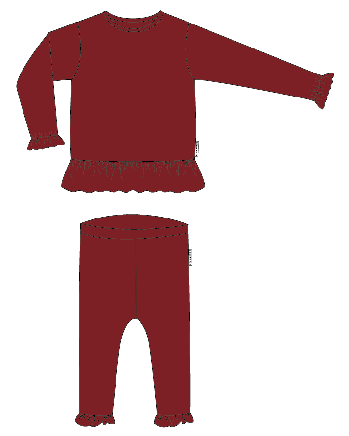 Låt oss presentera Tröja med leggings Mörkröd från Geggamoja, ett stilrent set perfekt för vinterns fester. Tröjan är tillverkad i ekologisk bomull och har eleganta volanger vid ärmslut och nederdel, vilket ger en extra touch av stil.