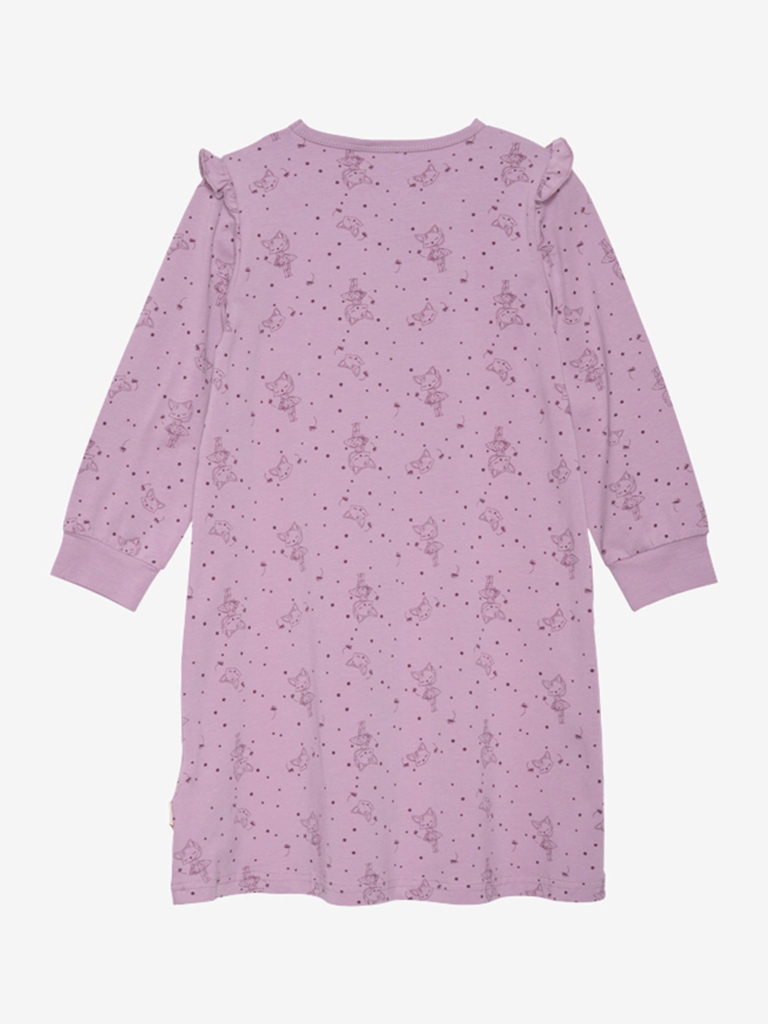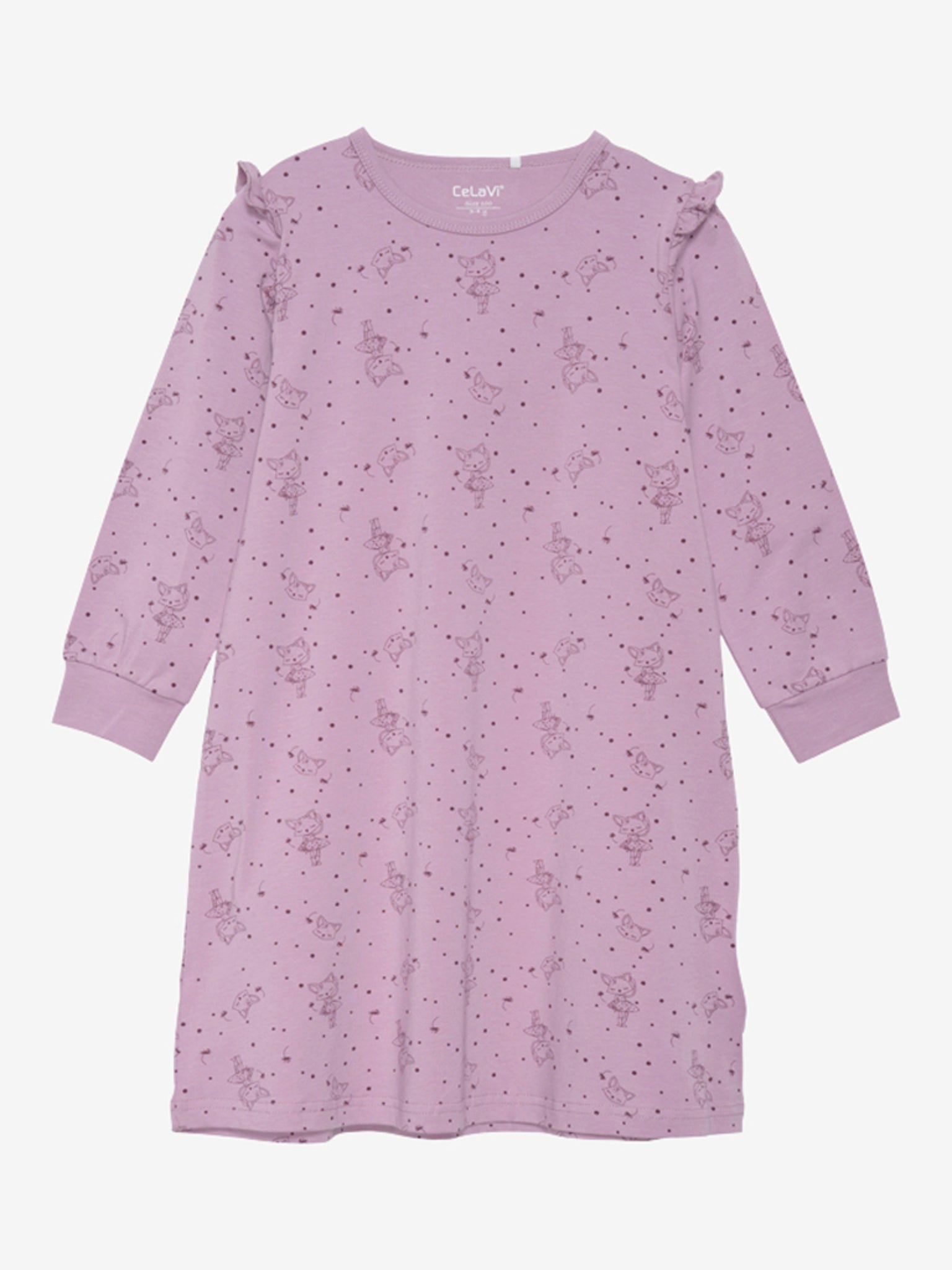 Låt oss presentera Nattlinne - AOP från Celavi. Detta bekväma nattlinne är tillverkat av singeljersey och har ett vackert tryck som ger en lekfull känsla. Med sin vidd nedtill och volanger på axlarna är det både stilfullt och bekvämt.