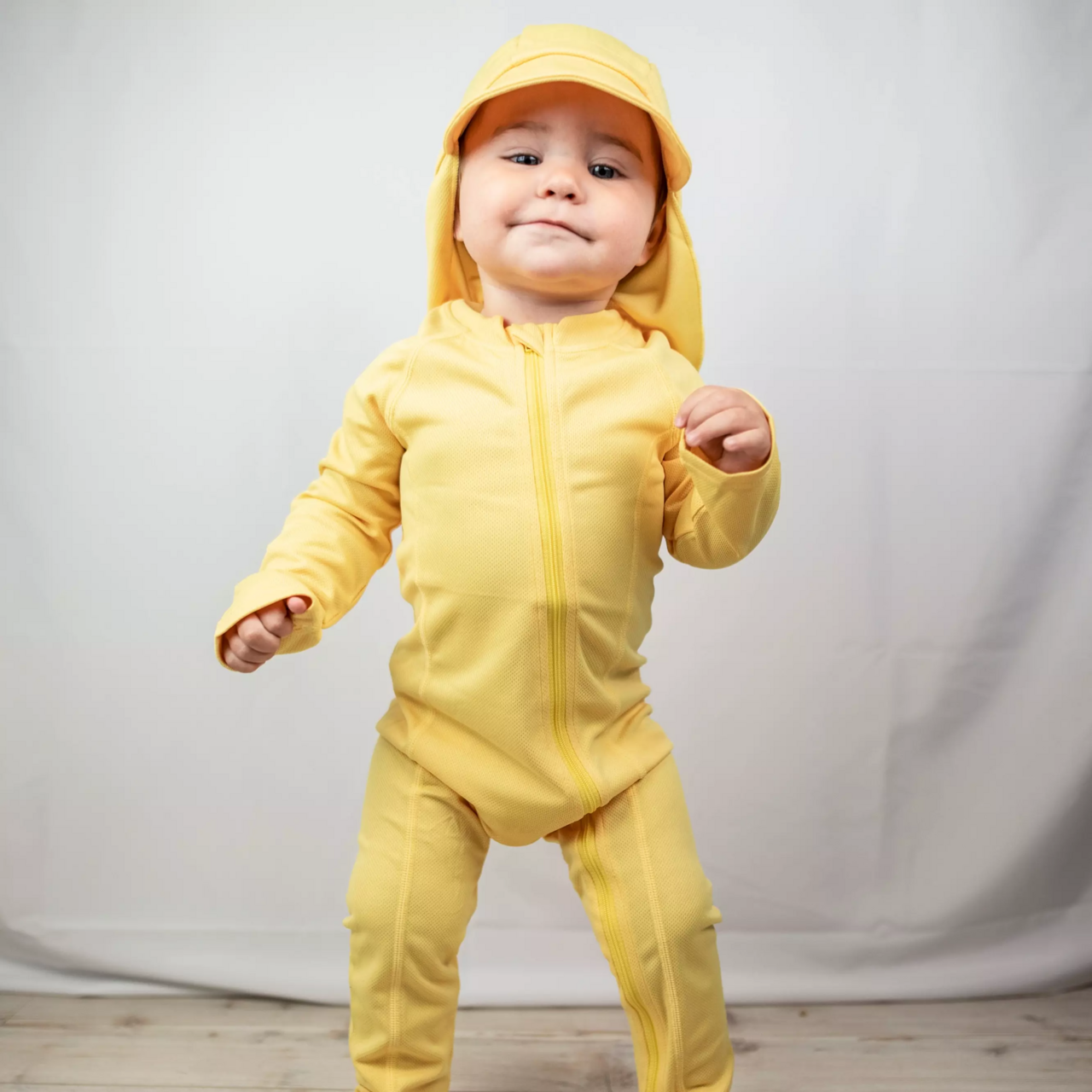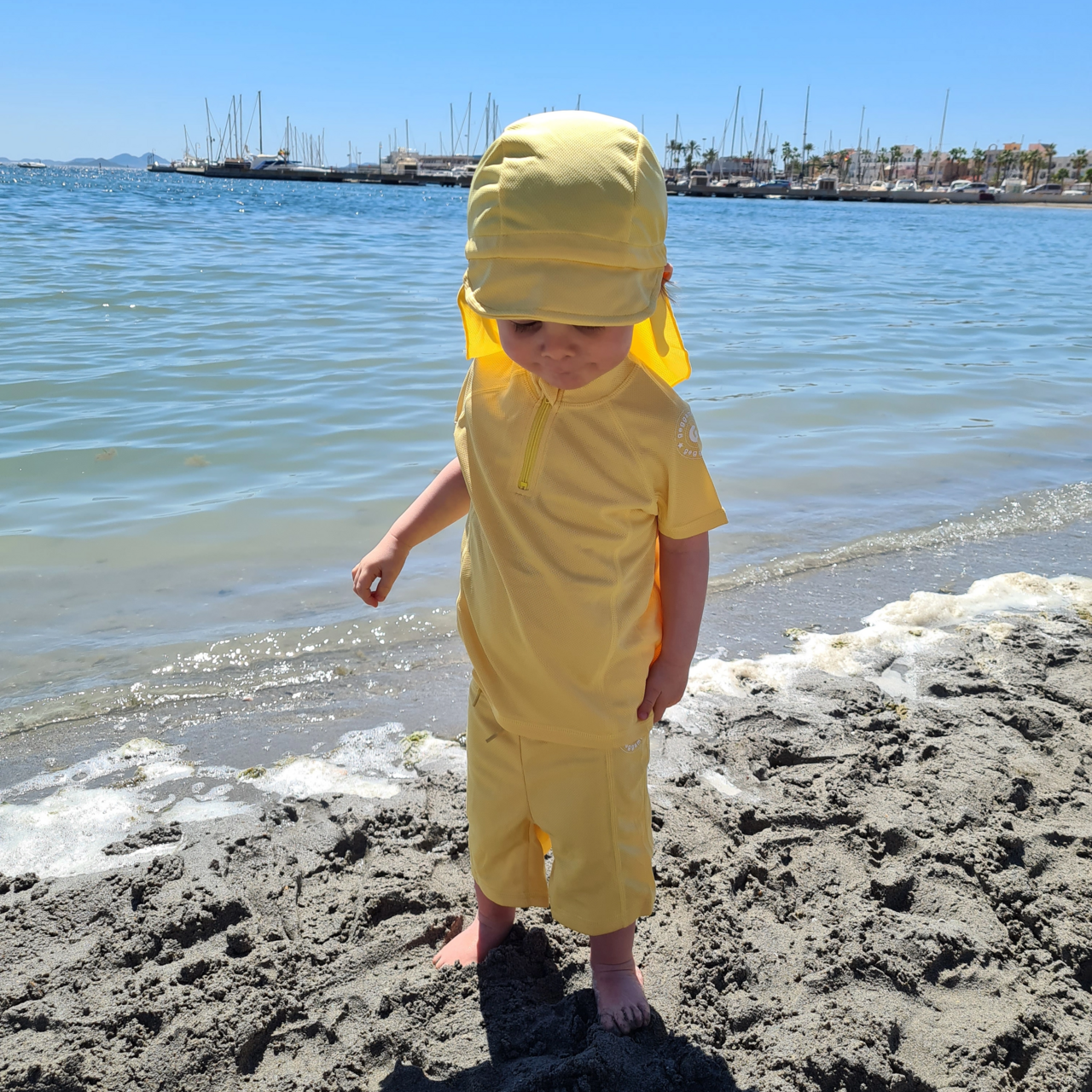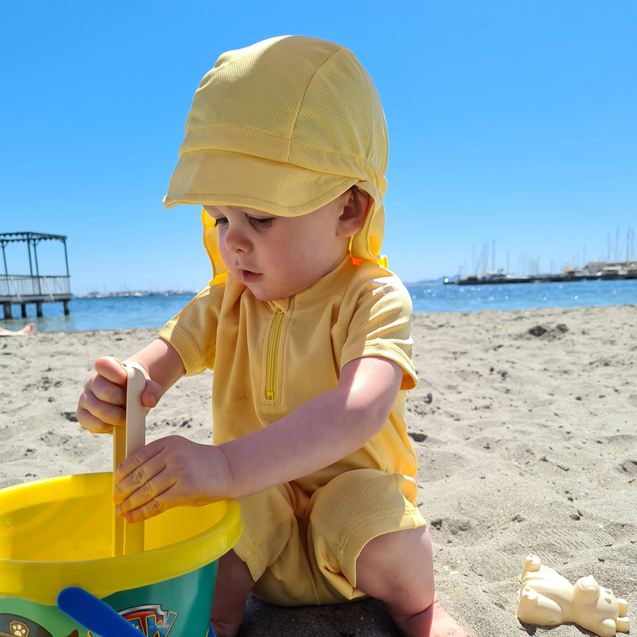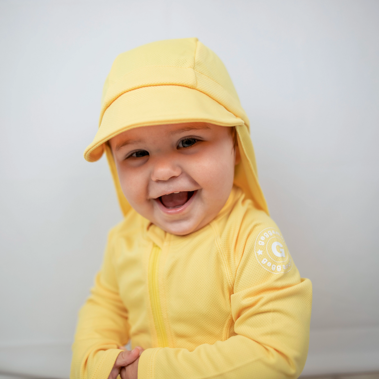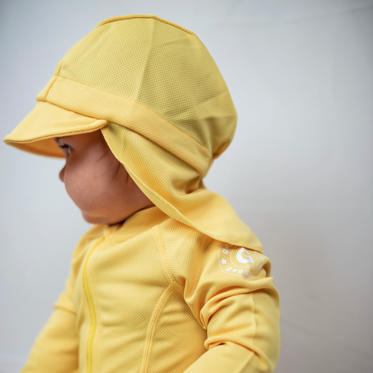 Låt oss presentera UV-Solkeps Gul från Geggamoja, en perfekt följeslagare för soliga dagar. Den breda skärmen skyddar både ögon och ansikte, medan det långa nackskyddet ger extra skydd mot solens strålar. Solhatten är designad för att hålla ditt barn svalt med sitt snabbtorkande och andningsbara material.