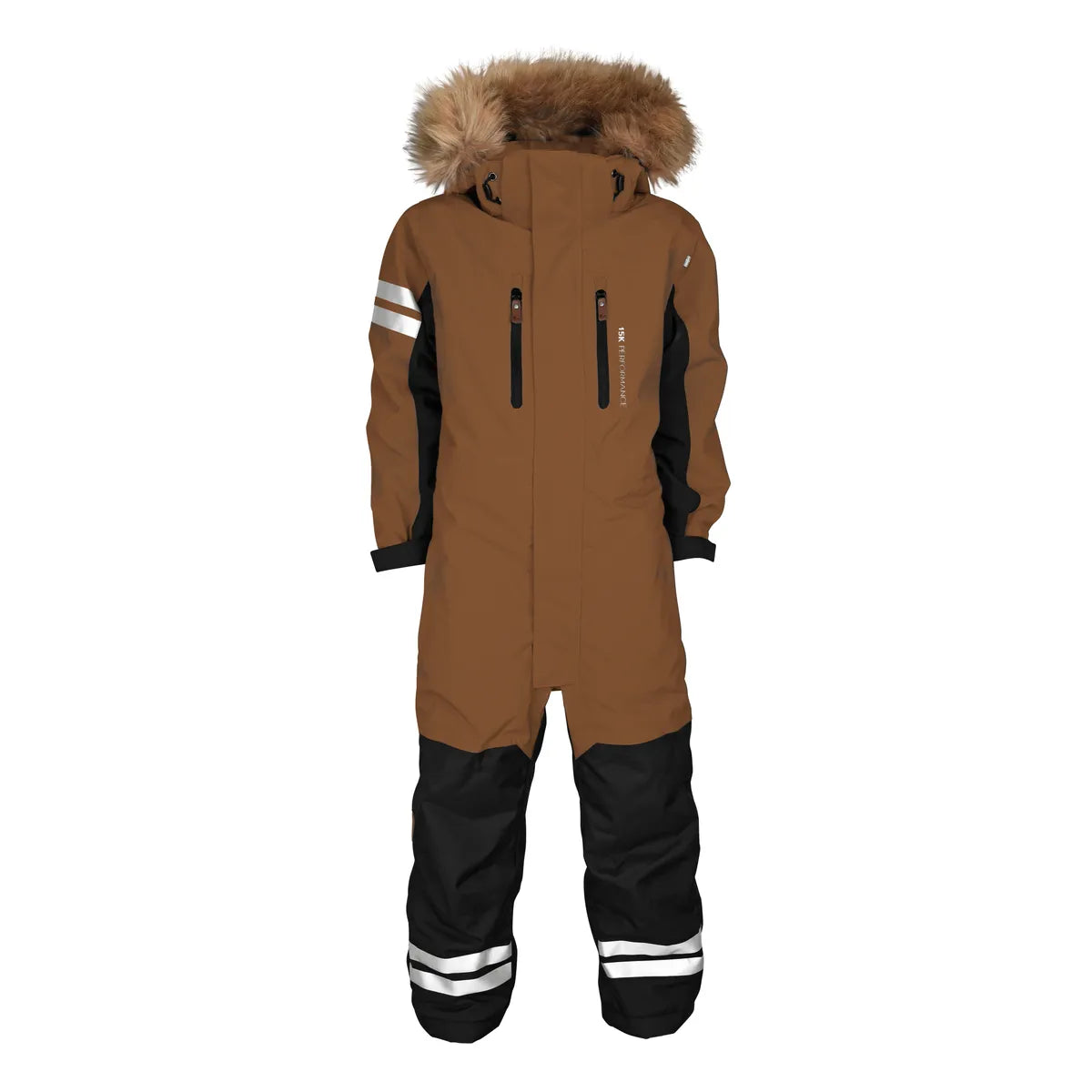 För extra hållbarhet är knän och säte förstärkta med slitstark Cordura. Fyra fickor – två sidofickor och två bröstfickor – erbjuder praktisk förvaring. Overallen har justerbara ärmslut med kardborre, innermuddar i lycra och en justerbar, avtagbar huva med syntetpäls för extra skydd. Bensluten är utrustade med snölås, fotstrappar och kardborrejustering för att enkelt kunna tas på över vinterskor.