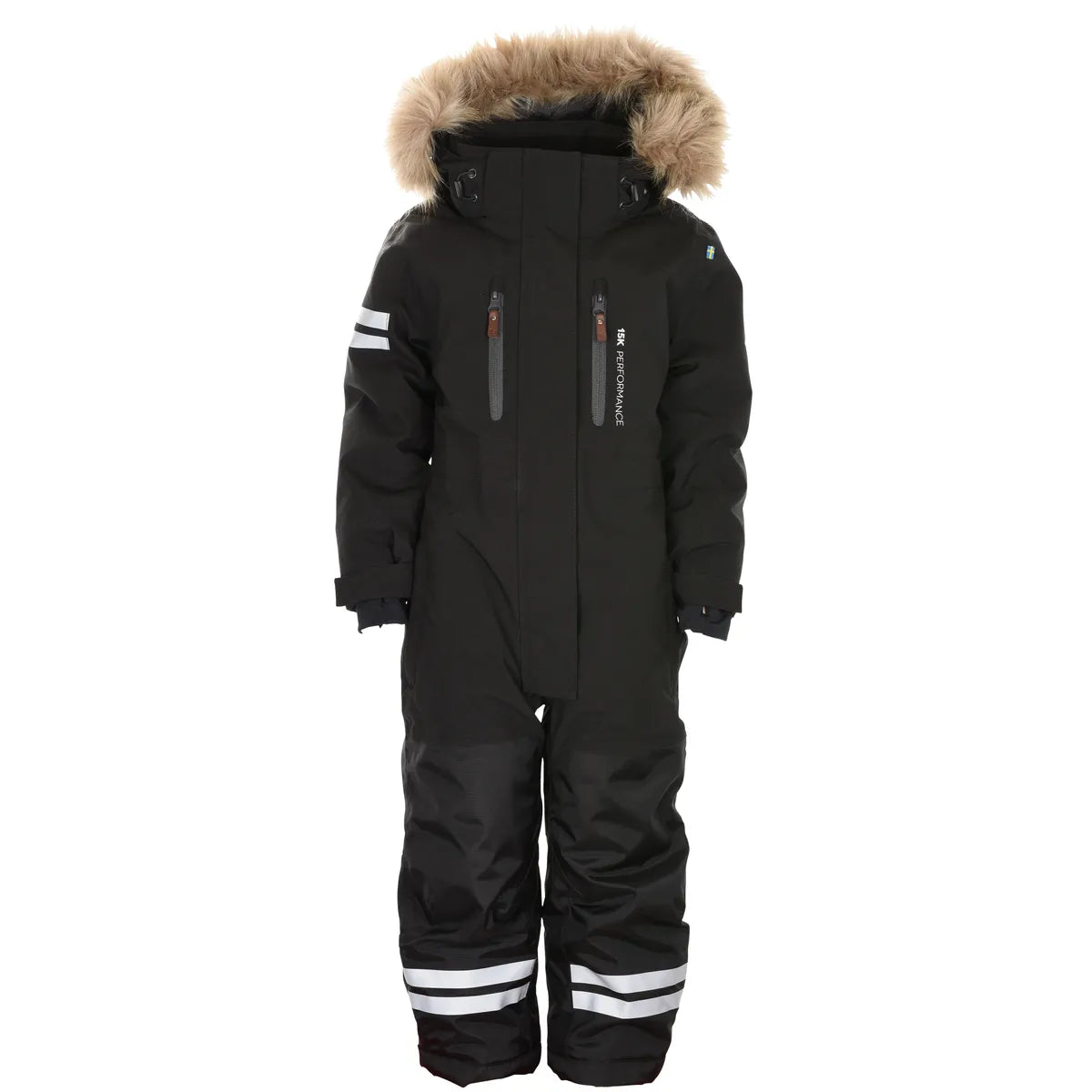 Detaljer: Fyra fickor, justerbara ärmslut med kardborre, justerbar/avtagbar huva med syntetpäls, snölås, fotstrappar.