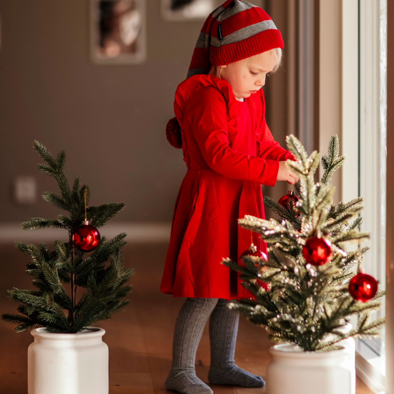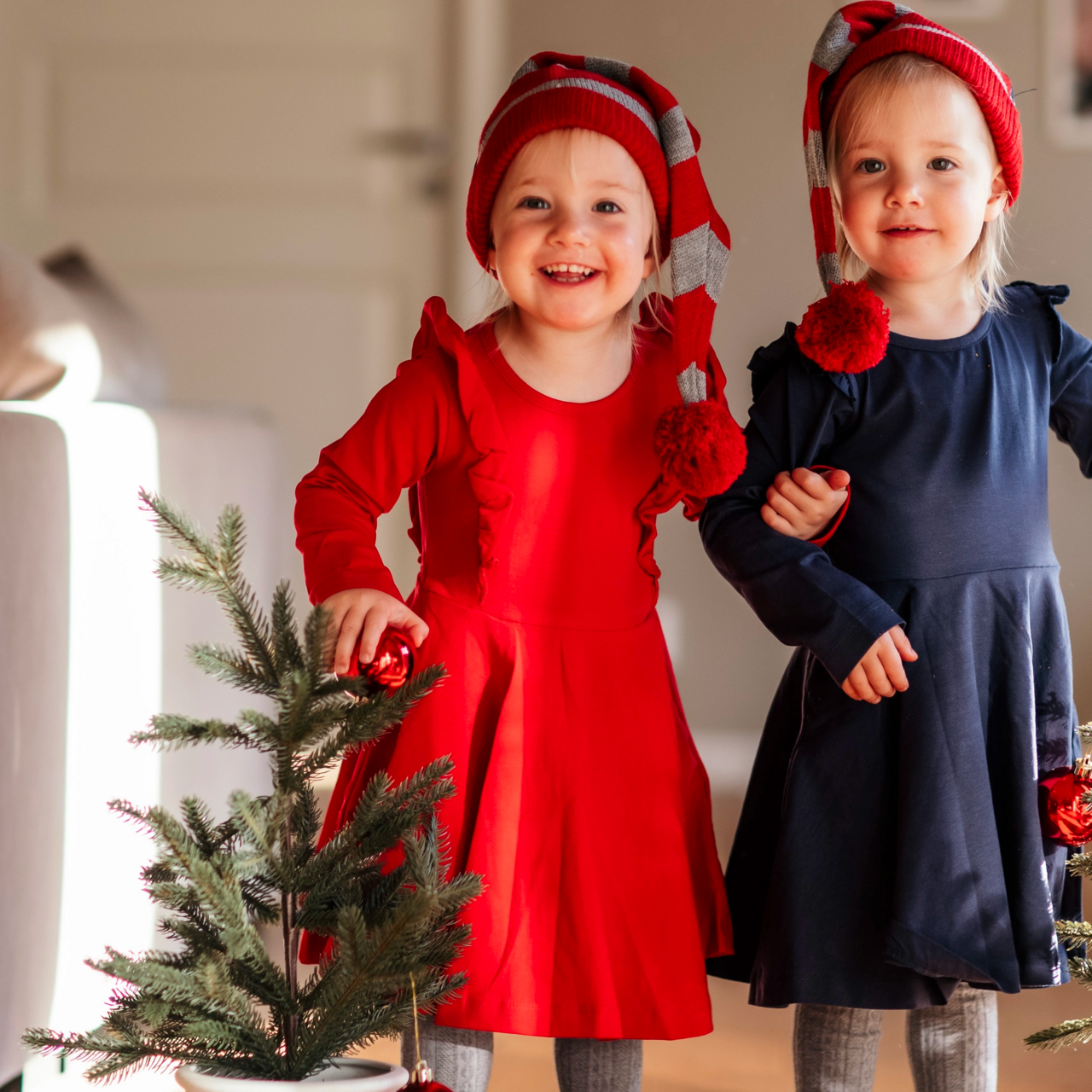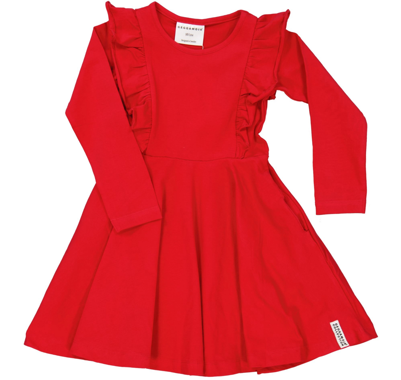 Låt oss presentera Klänning med volang Röd från Geggamoja, en underbar snurrklänning med lång ärm som är perfekt för både lek och fest. Den har en vacker volang framtill som ger en extra touch av elegans och stil.